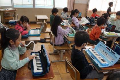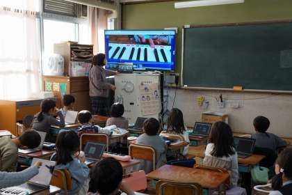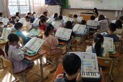1年生は,けんばんハーモニカの演奏をがんばっていました。自分の演奏した指を撮影して,ロイロノートの提出箱に送っています。一生懸命練習した成果を,みんなに見てもらえてとても嬉しそうでした。