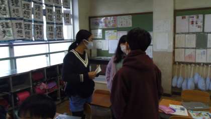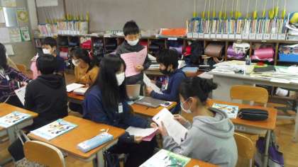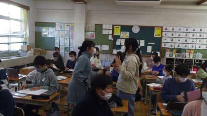 最後にグループやペアで小学校での一番の思い出とその感想などを伝え合いました。表現に慣れてきている子どもはメモを見ないで伝えていました。子どもたちは今週末から終業式までの間に家の人に小学校での一番の思い出をご家庭で伝えます。金曜日には家の方に記入していただく一言感想カードを持って帰ります。お子さまが小学校での一番の思い出を英語で紹介しますのでお聞きいただきましてカードに感想の記入をお願いします。