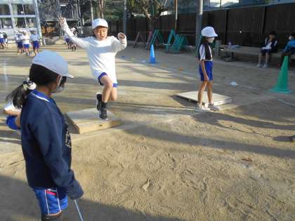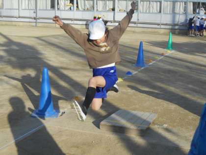 歩幅,助走の距離,腕の使い方,蹴り方を,考えて,1センチメートルでも多く跳べるように,工夫を重ねています。目指せ!幅跳びマスター!