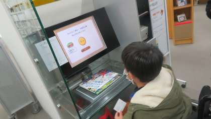 自動貸し出し機を使ったことのある友達が見本を見せてくれ、他の子どもたちがそれを見ながら上手に貸し出しの処理を行うことができました。また、窓口で貸し出しをしてもらうチームも丁寧な言葉遣いでお願いをして貸し出しの処理を行うことができました。