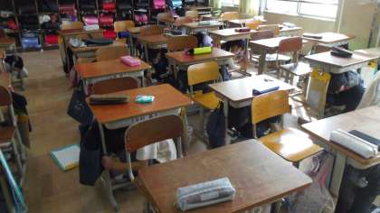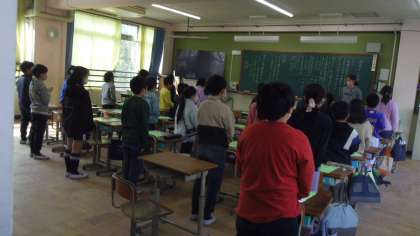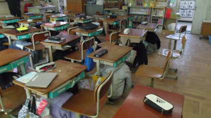大きな地震が発生したという想定でシェイクアウト訓練を実施しました。1時間目が終わったすぐあとで廊下に出ている人がいましたがすぐに自分の命を守る行動に出ることができました。訓練の後は東日本大震災で亡くなった方々に対して黙とうを行いました。