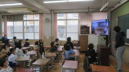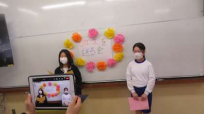 今回は、にこにこグループの教室に分かれて、オンラインを活用しながら6年生を送る会を実施しました。矢車学級→1年→2年→3年→4年→5年の順番に動画を視聴し、最後には5年生主体となり、にこにこグループの6年生に感謝の気持ちを伝えました。