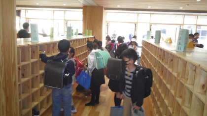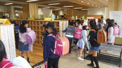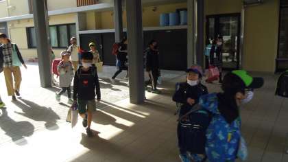 朝の登校の様子です。新しくできた本館で靴を履き替えてから教室に移動しました。