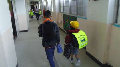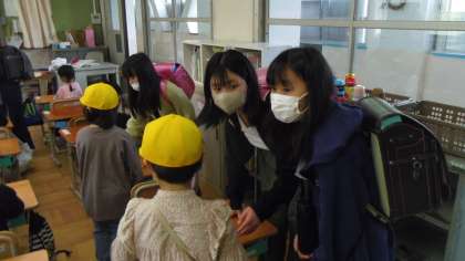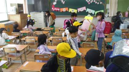 高学年の町別リーダーが1年生を教室まで連れて行って,ランドセルやお道具箱の片づけを手伝ってくれていました。