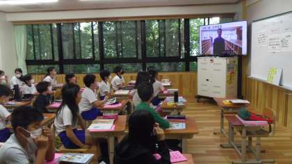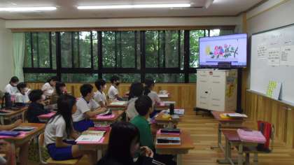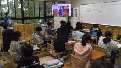 今日は4組と5組で外国語科の授業がありました。はじめに歌の学習をいました。そのあとに6年の担任の先生の自己紹介ビデオをを視聴しました。