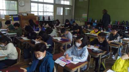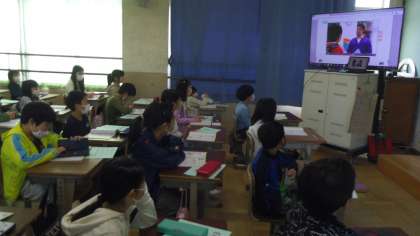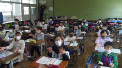 今日はALTの先生と一緒に学習しました。はじめにHelllo Song を歌いました。次にデジタル教科書を使ってLet's Watch and ThinkとLet's Listenをしました。動画を見て分かったことや音声を聞いて分かったことを交流しあいました。