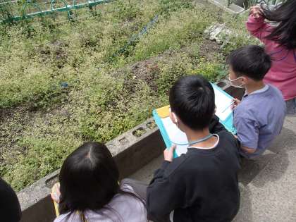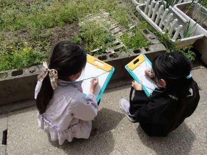 今日は花壇に出て,春の草花や生き物について観察をおこないました。春の草花や生き物について気付いたことや不思議に感じたことをワークシートにたくさん書くことができました。