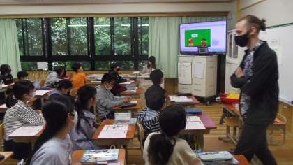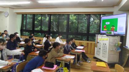歌の後でALTの先生の自己紹介を聞きました。その次にはデジタル教科書を使って出身地のたずね方,言い方に慣れ親しみました。