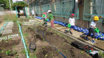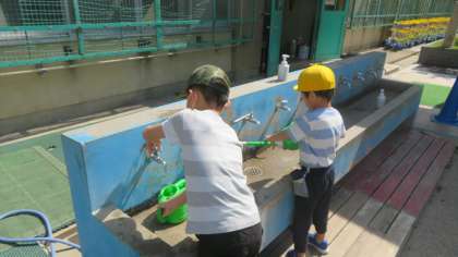 18日(木)、朝の会で水やりを行いました。気温が上がることが予想されたので、たっぷり水をあげました。