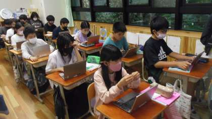 授業の前半は各自のギガ端末でデジタル教科書を使って表現や単語の練習をしました。