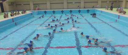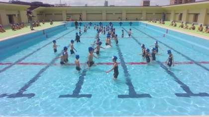 初めての水あそびでは、着替え方やプールでの約束、体操や入水の仕方など、たくさんのことを学習しました。腰洗いやシャワーの後、順番に低水位にゆっくりと入りました。水のかけ合いやわにさん歩きをすると、笑顔がこぼれ楽しそうに活動していました。
