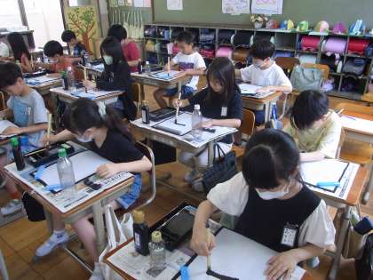 太筆と細筆を使い分けて、一生懸命バランスや線の太さを考えながら、文字を書いていました。6月の参観日で教室に掲示させてもらいますので、是非見ていただけたらと思っています。