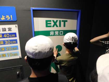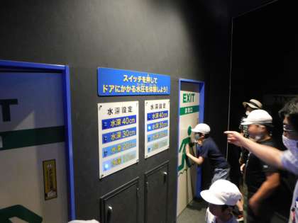 続いて、4Dシアターで「地下街に雨が入ってきたら…」という体験をしました。普段は開いていたドアも水がドアを押すと力をこめないと開きませんでした。水深が10cmでは力をこめれば開いたドアも、水深が20cmになると開けられる人は半分ぐらいでした。水深が30cmでは開けられる人はほぼおらず、水深40cmでは大人であっても開けることができませんでした。