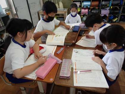 3年国語科「こまを楽しむ」では、段落の繋がりを調べ、学習で分かったことを伝え合いました。子ども達は、積極的に意見交流をしていました。