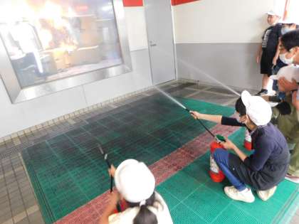 消火体験では消火器を使い、火を消す体験をしました。使うことがない消火器を使う体験ということでとても貴重な経験ができました。