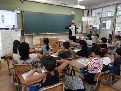 外国語活動「 I like blue. 」ではALTの先生と一緒に色々な色の言い方を学びました。自分だけの虹を作って紹介しました。