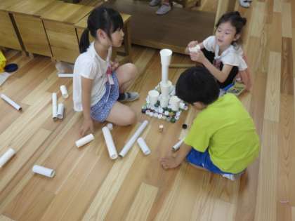 「ならべて ならべて」の学習で初めて図工室を使って学習をしました。箱やトイレットペーパーの芯、紙コップ、ペットボトルのキャップ、割りばしなど身の回りにあるものを並べたり積み重ねたりして楽しみました。「お城みたいになったよ。」「紙コップの間にキャップを入れるとグラグラタワーができたよ。」など友達とアイデアを交流したり、形をつなげたりと工夫して活動する姿が見られました。学習後には「もっとしたかったな。」「またしたいな。」という声も聞かれ、とても楽しく活動できたようです。材料集めにご協力いただき、ありがとうございました。