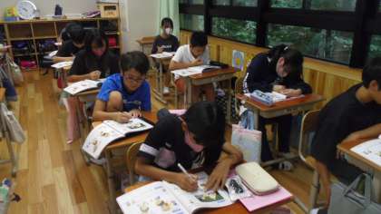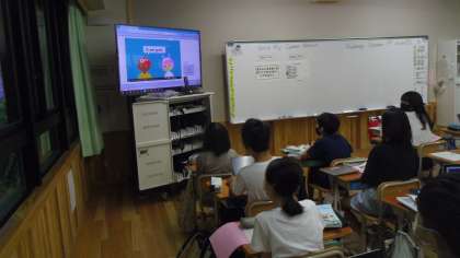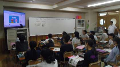 次にデジタル教科書を使って感想をたずねたり言ったりする表現に慣れ親しみました。今日は西院中英語科の先生と一緒に学習に学習しました。
