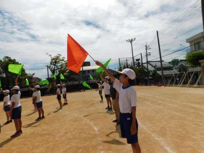 初めてのフラッグなので扱いや振り方が難しかったですがしっかりと話を聞き一生懸命踊る姿がたくさん見られました。かっこいい演技ができるように練習を重ねていきます。