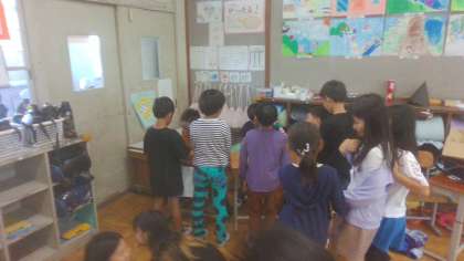 生活科の学習で、動くおもちゃを作り、そのおもちゃを作った楽しい遊び方を考えています。ルールや得点、時間など、自分たちで遊びながら考えています。