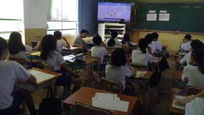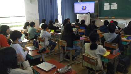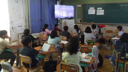 Unit5の6時間目の学習をしました。はじめに歌を歌いました。I Love the Moutains.の歌は今日が最後なので子どもたちはしっかり歌いました。