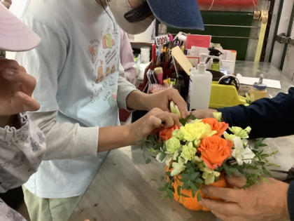 お花屋さんでは、フラワーアレンジメントを実際に体験させていただきました。たくさんの質問にも答えていただきました。お仕事をしているときに気を付けていることやお仕事をしていてうれしいときについてもお話しいただき、とても貴重な経験ができました。