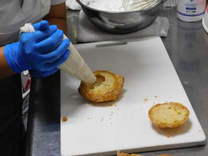 ケーキ屋さんではシュークリームにホイップを入れ、シュークリームが完成するところを見せていただきました。ケーキ屋さんでも大変多くの質問に答えていただきました。