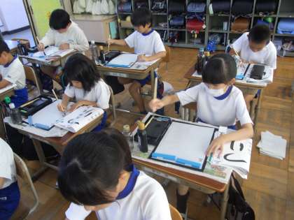 毛筆で、初めてひらがなの文字を書きました。バランスや文字の大きさ、太さを考えて、一生懸命書いている姿が見られました。