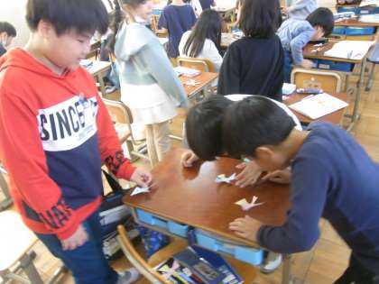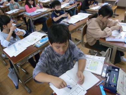 コンパスを使って円をかいています。円の中に直線を引いて、直径や半径の長さを測って、2つの関係について調べたりしています。楽しそうにコンパスを使っています。