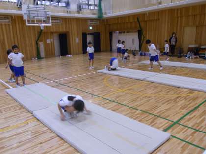 マット運動では、前転や後転の連続技や、発展技に挑戦しています。友だちと、回る時のポイントを確認しあいながら、練習をしています。