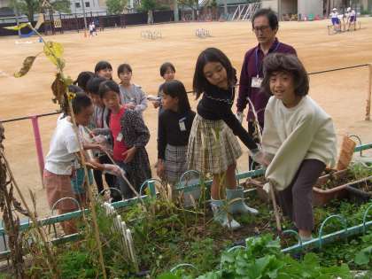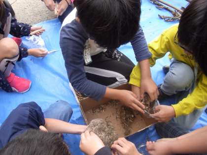 育てていた植物を抜き、種を集めました。大きな植物を、友だちと協力して抜いていました。