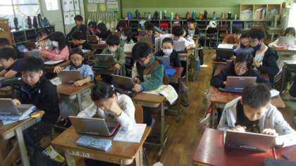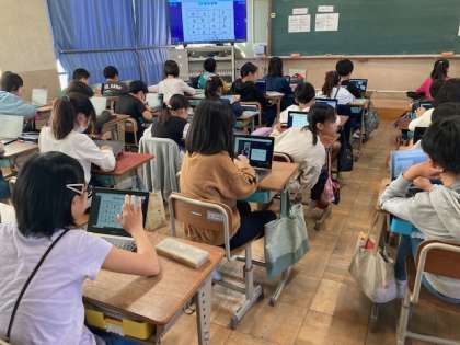 次にビンゴゲームでアルファベット小文字の読み方に慣れ親しみました。子どもたちはギガ端末で配られたカードを並べてビンゴゲームをしました。