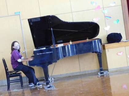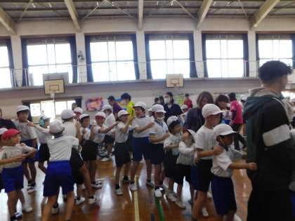 「♪かも〜つれっしゃ〜 しゅっしゅっしゅ〜」の音楽に合わせて、体育館を歩き、最後に出会った人とじゃんけんをしました。10校の校長先生や育成学級の友達と楽しくじゃんけんをして、最後には約100人がつながった列車が完成しました。