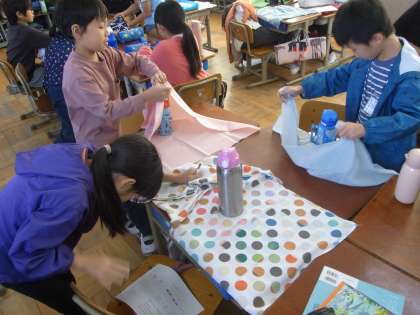 11月1日は、古典の日です。3年生では、ふろしきを使っていろいろな物をつつみました。はじめは、難しいと感じていたつつみ方も、何度も挑戦することで、上手につつめるようになっていました。昔の人たちが、持ちやすいつつみ方を考えていることに驚いたり、今と違って毎回ふろしきでつつんでいて大変だったと感じていました。