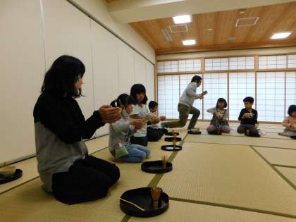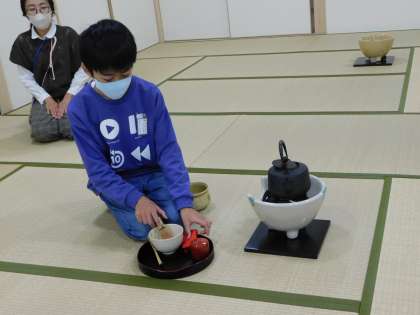 初めに、茶道で大切な心得「和敬清寂」のお話やで使う道具の名称、扱い方の説明を聞きました。そしてそのあと、矢車学級の畑でとれたサツマイモでつくった「いもようかん」を食べ、自分でたてた抹茶を飲みました。「ちょっとにがいけどおいしい。」「たてるのが難しかった。」と感想を話す子どもたちでした。