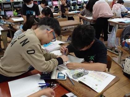 3年算数科「円と球」では、コンパスを使って自由に模様を作図しました。子どもたちは、班の友達と協力し合いながら楽しく作図していました。
