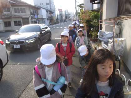 子どもたちは、列に並んで安全に気を付けて道を歩くことができました。
