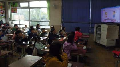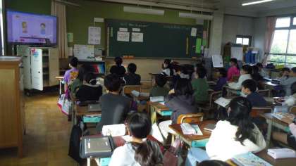 授業の前半はデジタル教科書のチャンツをしたりALTの先生の後に続いて言ったりしてほしいものをたずねたり、答えたりする表現に慣れ親しみました。
