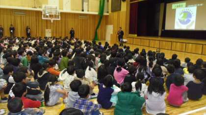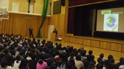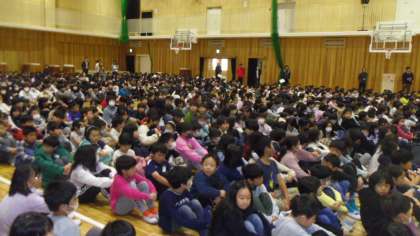1時間目に全校児童がアリーナに集まり、人権朝会を行いました。校長先生から世界人権宣言についての話や絵本「へいわってどんなこと?」の読み聞かせをしました。