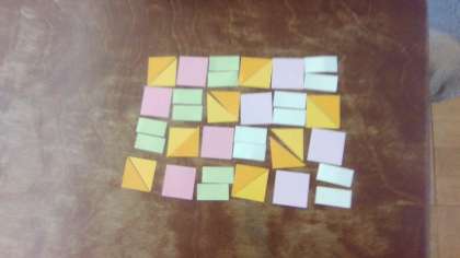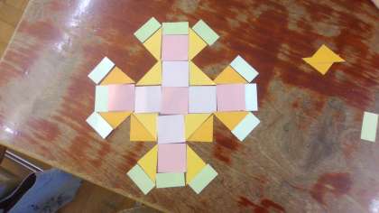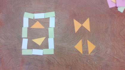 2年生では、三角形と四角形はどのようにできているのか、また、正方形、長方形、直角三角形について勉強しました。学習の終末には、模様づくりをしました。きまった形をいろいろに組み合わせるときれいな模様になることを知り、楽しみながら考え取り組んでいました。
