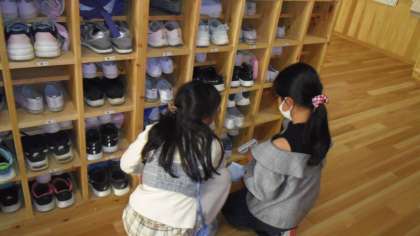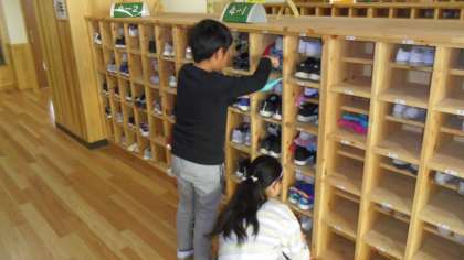 玄関昇降口で自分の学年の下駄箱の掃除を頑張っている子どもたちです。