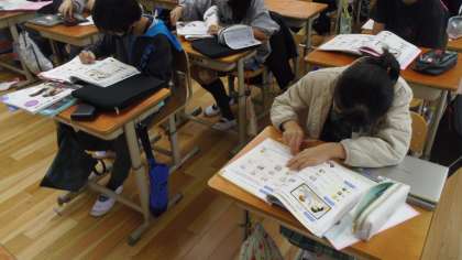 最後にLet's write.をしました。小学校での一番の思い出を丁寧に書きました。