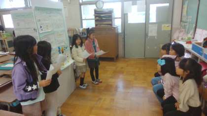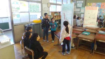 生活科の学習で取り組んだ「あそんでためしてくふうして」の内容をポスターにまとめ発表しました。今回は、他のクラスと交流し、少し緊張も見られましたが、みんなしっかりと聞こえる声で発表することができました。聞く側は、質問や感想を言うことができ、しっかりと発表を聞くことができました。