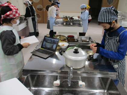 5年生は家庭科の調理実習で、ご飯を炊き、みそ汁を作りました。家庭科室での本格的な調理実習はこれが初めてでしたが、みんなこの実習に向けて、作り方を確認したり、切る、炊く、洗い物などの役割を決めたりしました。実習中はグループの友達で協力することができ、手際よく、ケガなく進めることができました。その姿はとても頼もしく見えました。「ガラス鍋で炊いたのでご飯が炊ける様子がよく分かった。」「みそ汁はみぼしでだしをとると、とてもいい香りがして美味しい。」「今度は鰹節でだしをとってみたい。」などの声が聞こえました。これから、五大栄養素の学習もしていく中で、調理の技術と共に、栄養に関する知識も高めていってほしいと思います。