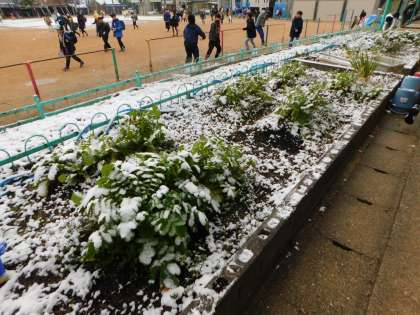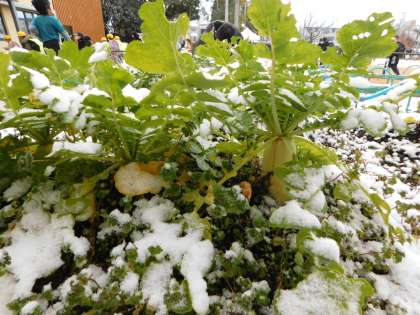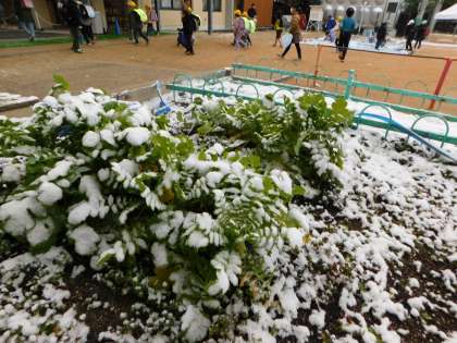 朝は雪がうっすら積もっていました。中間休みには雪はとけていました。