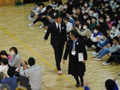 19日(月)、西院小学校アリーナにて、151周年を記念して元阪神タイガースの桧山進次郎さんに来ていただき、講演をしていただきました。
