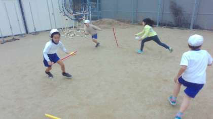 体育科の学習「ようぐあそび」をしています。フラフープを使ったり、棒を使ったりして楽しみました。「こうやったらうまくころがるよ!」「そっと離すとぼうがたおれにくいよ」と友達同士でアドバイスする姿も見られました。