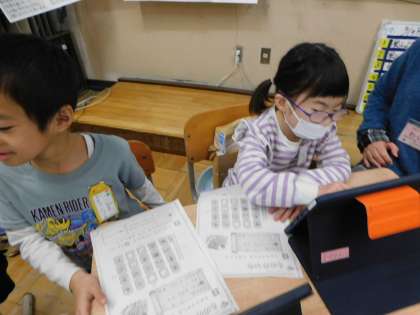 スクラッチを使い、「上に1、右に1」などブロックをプログラミングして、宝のある場所までネコを動かします。子どもたちは、試行錯誤を繰り返しながら宝のある場所まで動かすことができました。
