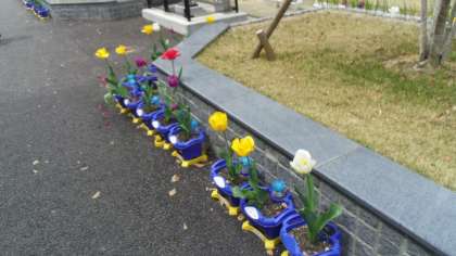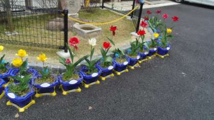 縄跳び広場ではチューリップがきれいに咲いています。初夏を思わせる暑さのために花が落ち始めているチューリップもあります。