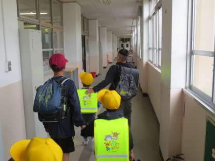 1年生が小学校に入学してきて、何日か経っています。6年生は、1年生が安心して学校に来ることができるように、教師まで一緒に送っていき、準備をするお手伝いをしています。優しく声を掛けたり、手をつないだりして、1年生のために頑張ってくれています。